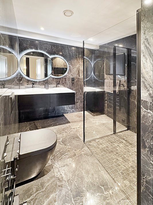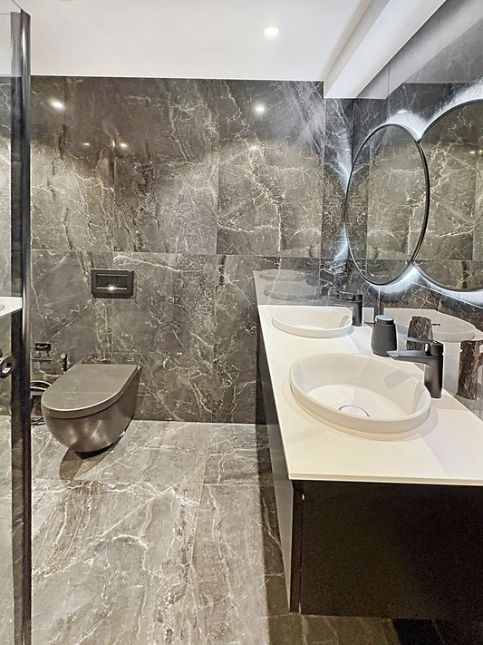 Dette moderne baderommet i Akershus, kombinerer mørke marmorinspirerte fliser med stilrene detaljer for et tidløst uttrykk. Dobbel servantløsning med opplyste speil og svarte armaturer gir både funksjonalitet og eleganse. Det minimalistiske designet kompletteres av et dusjkabinett med klare glassvegger og svarte rammer. Praktiske løsninger som vegghengt toalett og håndkletørker sikrer komfort og stil. Et baderom der luksus møter hverdagsbehov.